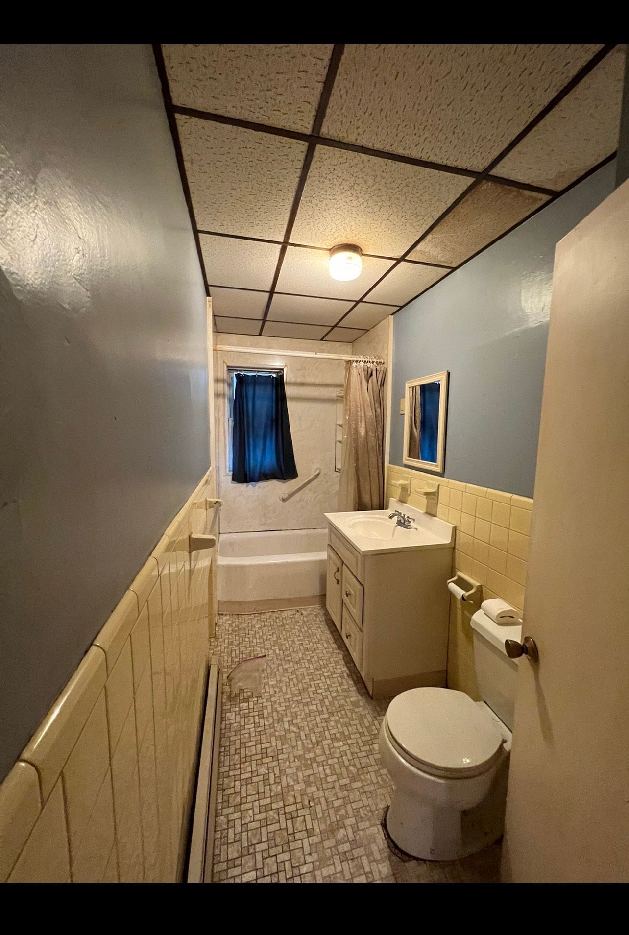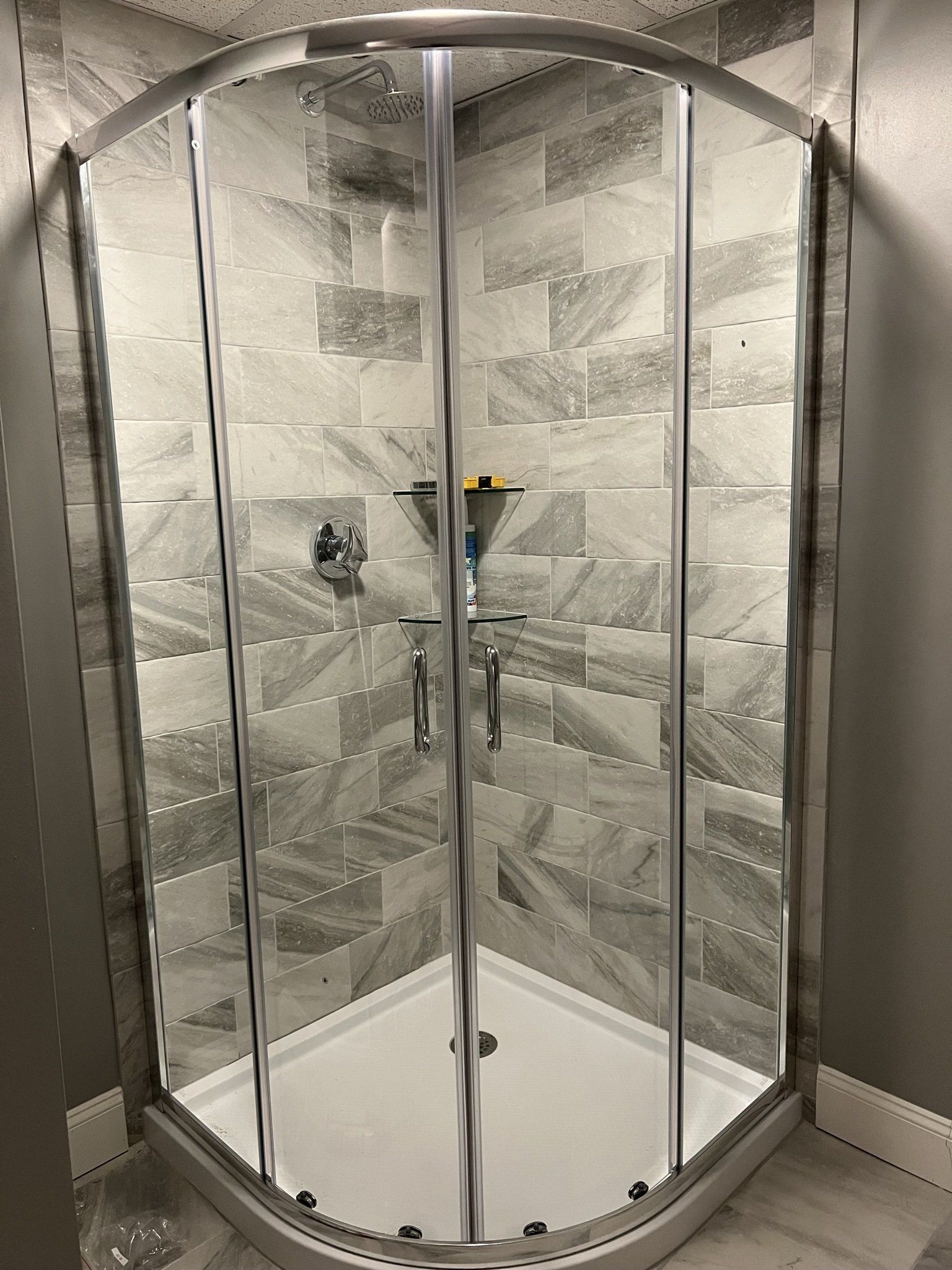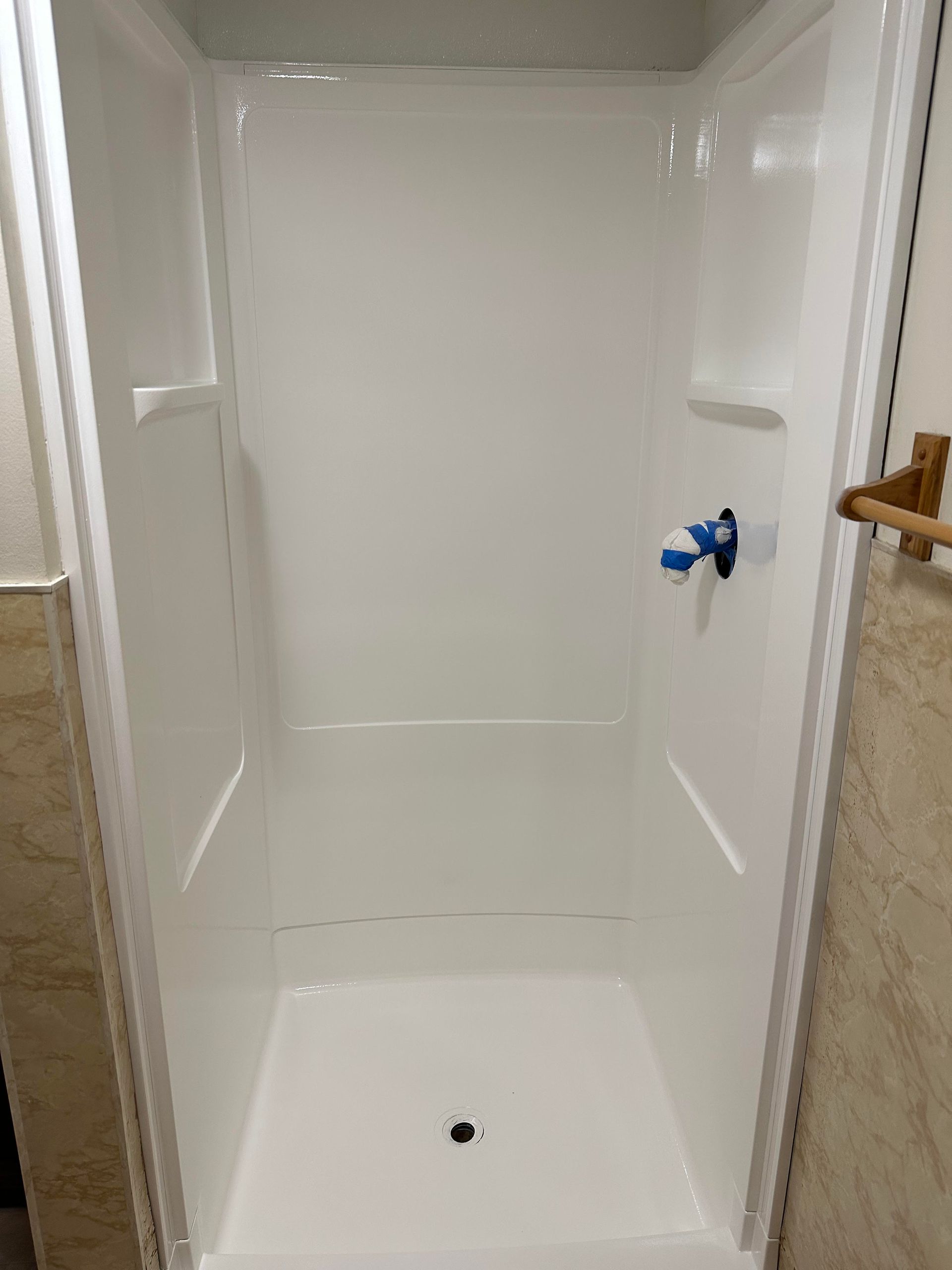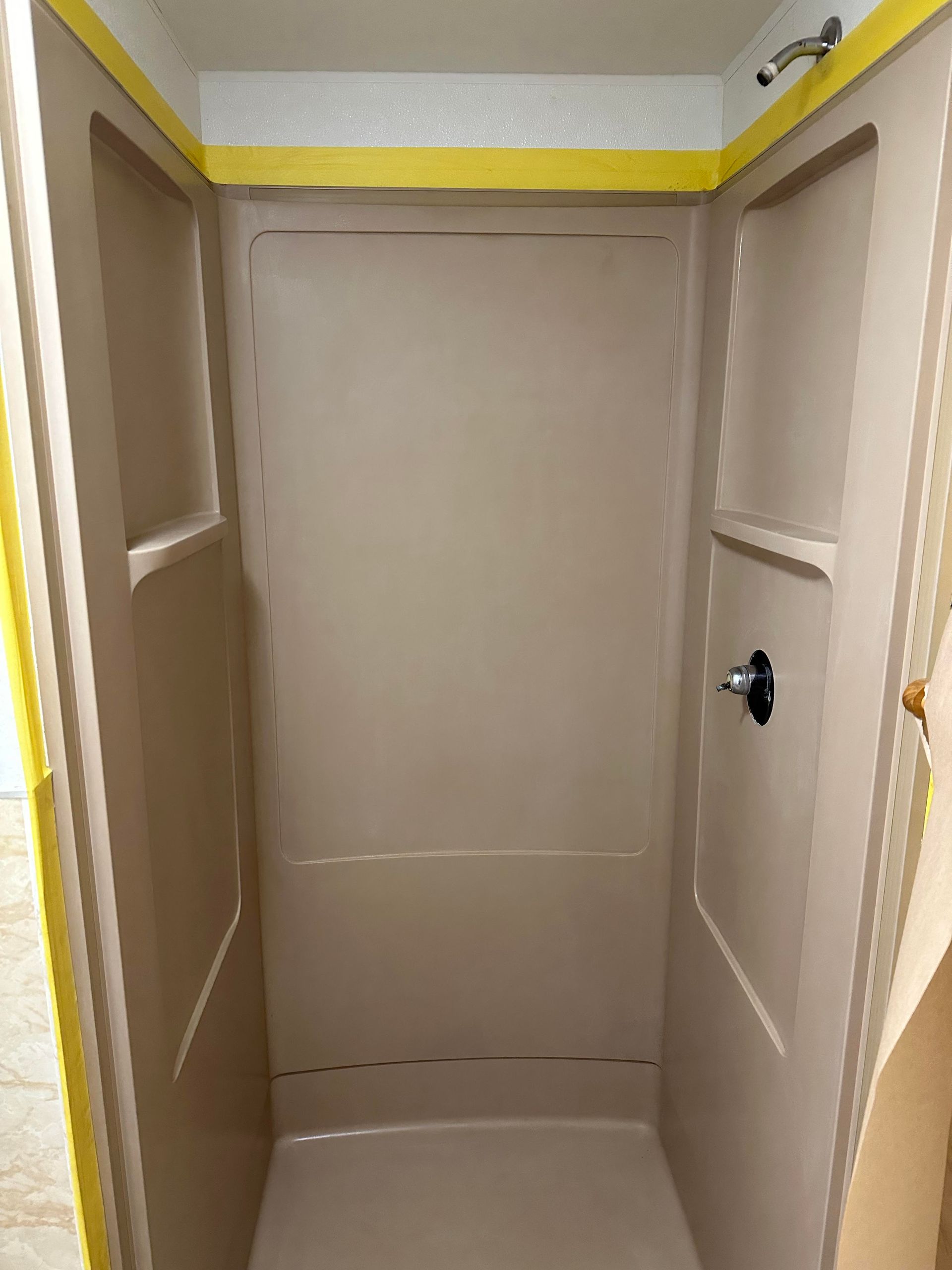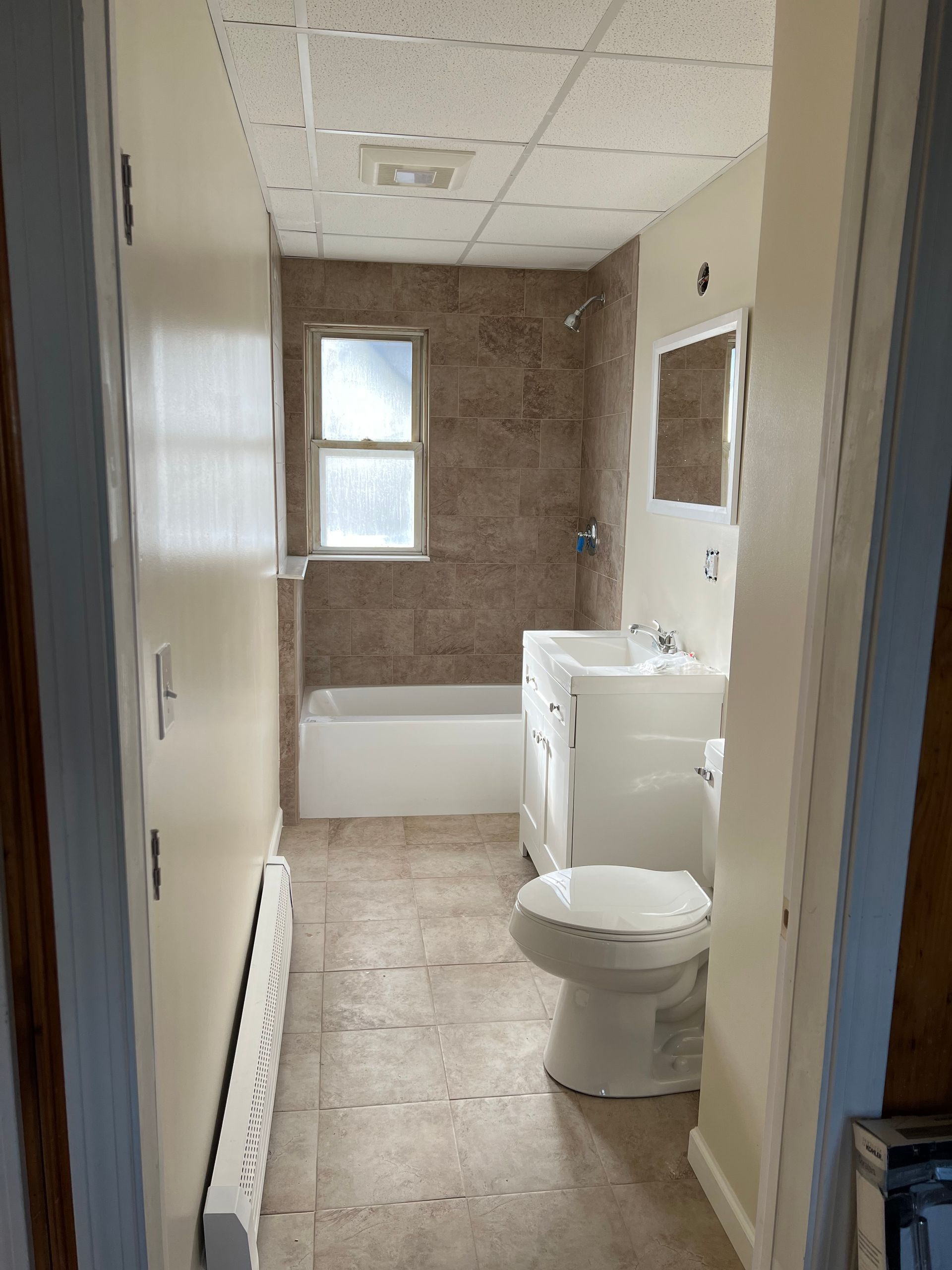 Third floor apartment bath renovation where tub was removed and replaced using a corner shower pan with sliding glass doors. Bath vanity moved from the left side of tub to the right side of shower. Bath was completely tiled including shower and flooring, sheet-rocked and painted. The top two photos show the "before" view of the tub which is now the exact location of the corner shower design.